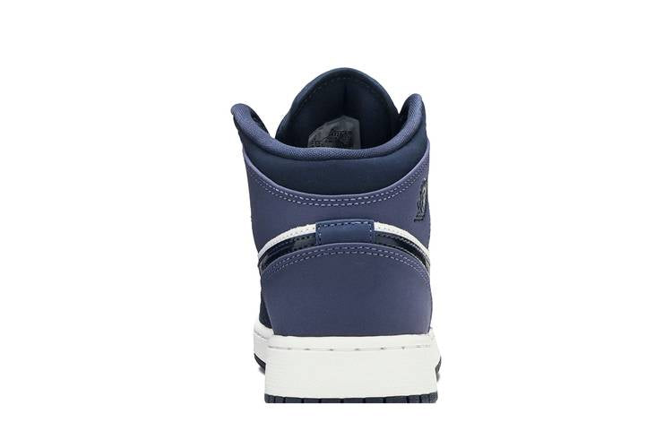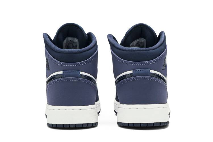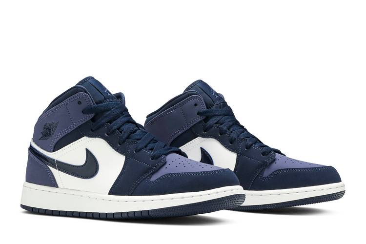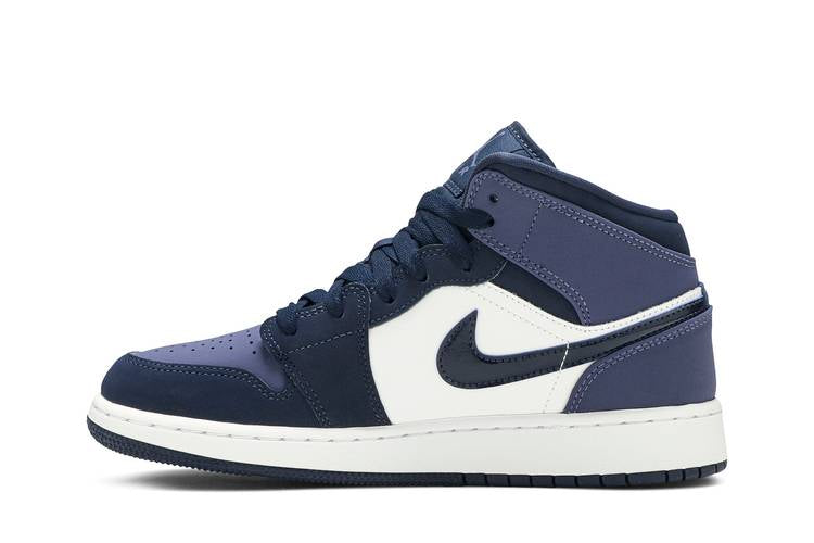 The Jordan 1 Mid Sanded Purple (GS) showcases a leather and nubuck upper in white, Obsidian, and Sanded Purple hues, along with a perforated vamp in Sanded Purple. The design...