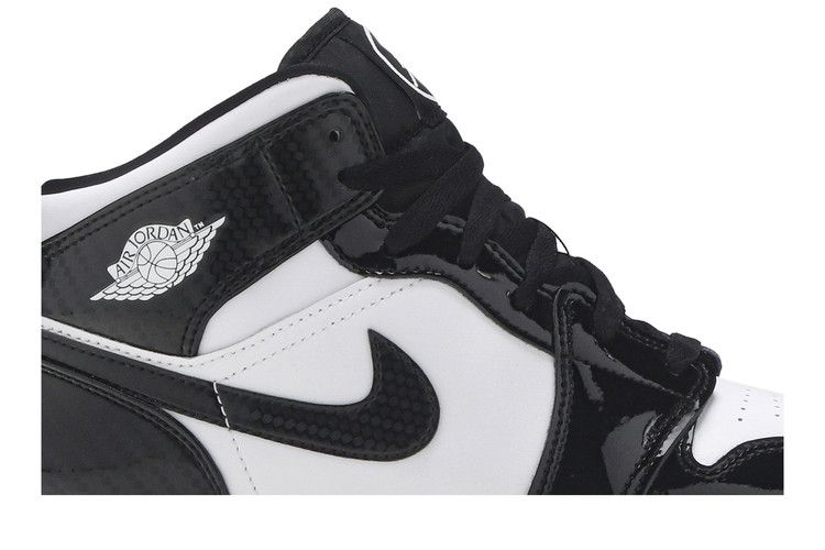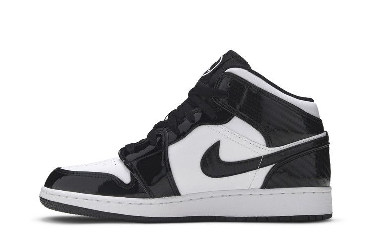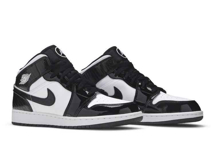 The Air Jordan 1 Mid SE All-Star 2021 (GS) is a mid-top sneaker designed for big kids. It features a white leather upper with black patent leather overlays and faux carbon fiber detailing on the Swoosh, heel, and collar flap. The shoe also includes a Wings logo on the collar flap and a Jumpman icon on the tongue tag. With a cushioned midsole and durable rubber outsole, this shoe offers both style and comfort. Released on March 6, 2021, this sneaker is a stylish tribute to the NBA's midseason showcase.