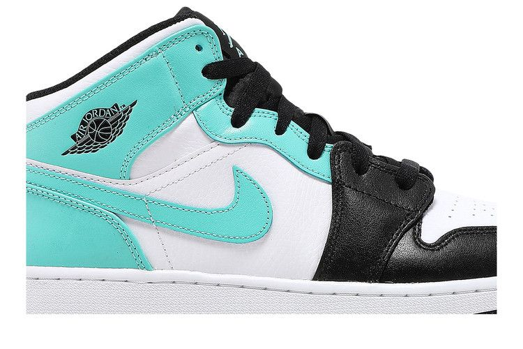 The Air Jordan 1 Mid Tropical Twist Igloo (GS) features a white leather upper with black overlays and teal accents on the heel and collar. The Swoosh, Jumpman logo, and Jordan Wings logo add pops of color to the design. A rubber cupsole with an encapsulated Nike Air unit provides lightweight cushioning for comfort. This retro silhouette is designed for big kids and combines style with functionality.