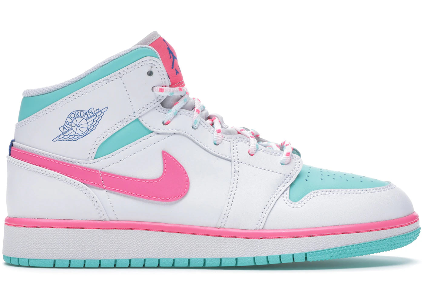The Jordan 1 Mid White Pink Green Soar (GS) is now available at Side Kicks!