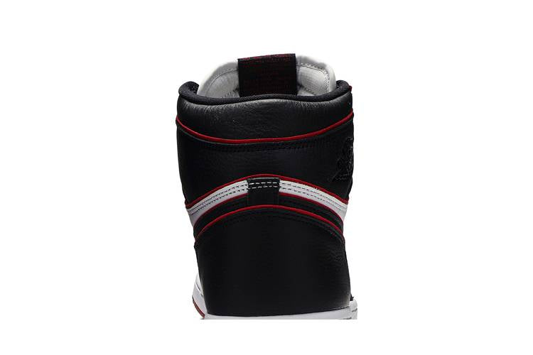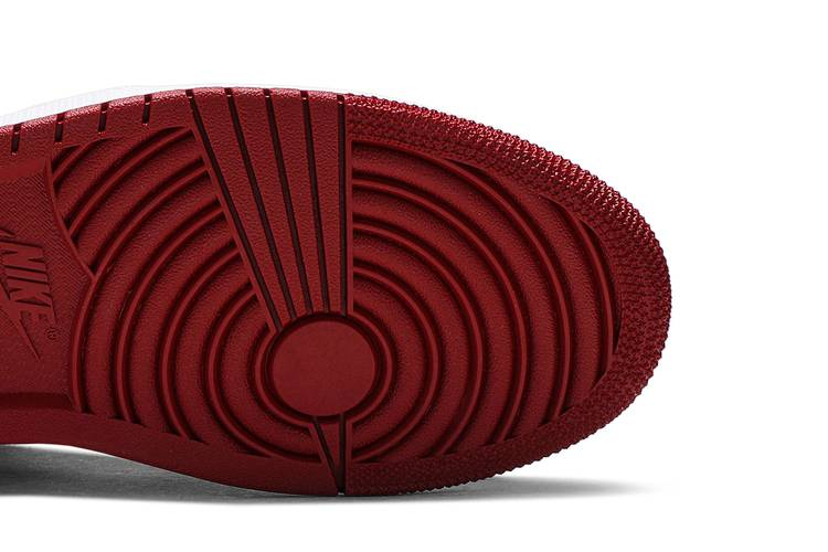 The Jordan 1 Retro High Bloodline features a white leather upper with black overlays and red accents, paying homage to the Chicago Bulls. The design includes iconic details like "Nike...