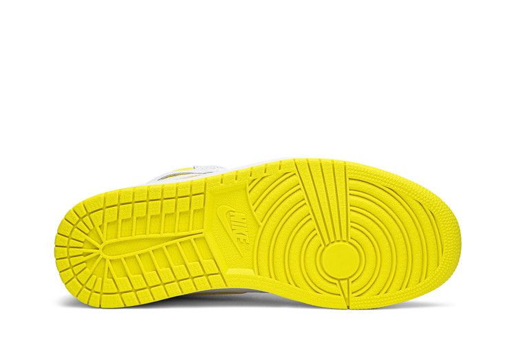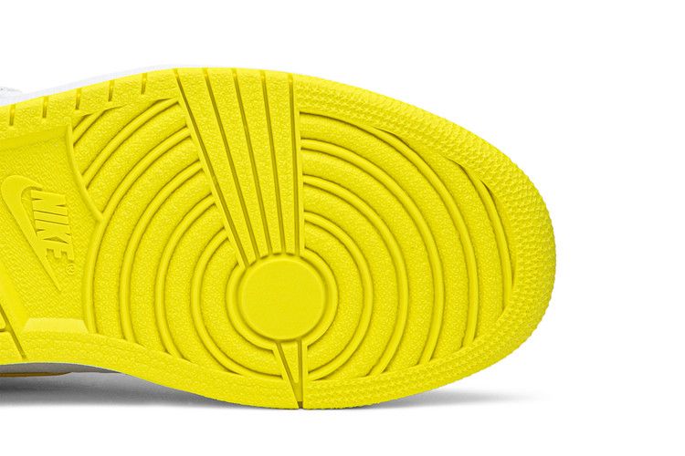 The Jordan 1 Retro High First Class Flight has a white, black, and Dynamic Yellow leather upper with perforations on the toebox. UPC barcode stamps decorate the lateral heel, while...