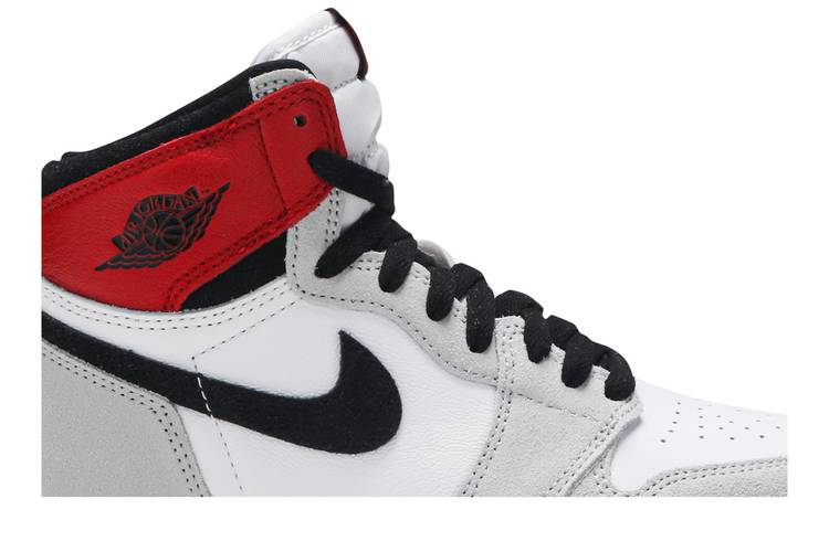 The Air Jordan 1 Retro High Light Smoke Grey (GS) features a combination of grey, white, red, and black colors inspired by the Chicago Bulls. Constructed with premium leather and suede overlays, this sneaker offers a sleek and stylish look. Released in July 2020, this model is a must-have for any sneaker enthusiast.