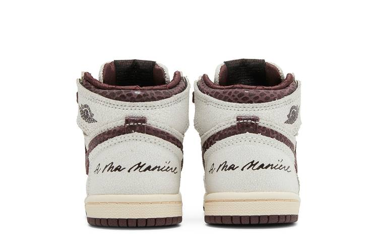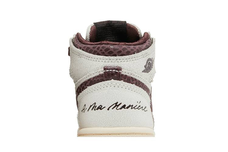 The Jordan 1 Retro High OG A Ma Maniere TD is a collaboration between Jordan Brand and A Ma Maniere boutique, featuring a Sail/Burgundy Crush colorway. The shoe boasts a cracked-white leather upper, quilted interior lining, and burgundy snakeskin Swooshes. The Wings logo is on the collar, while the tongue showcases "A Ma Maniere" and "Nike Air" detailing. The design includes an artful expression on the side of the shoe. A burgundy outsole and cream rubber midsole complete the look.