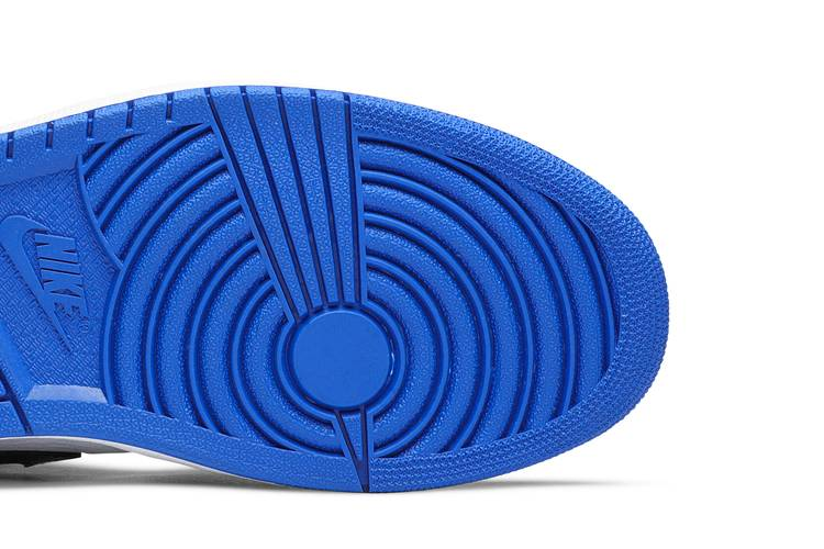The Air Jordan 1 Retro High OG 'Royal Toe' features a white leather upper with black overlays and Game Royal accents. The shoe includes a padded nylon tongue with a...