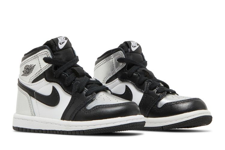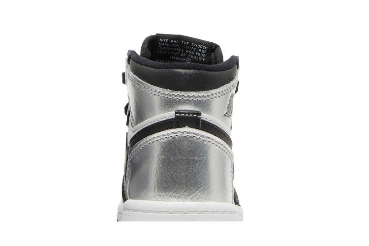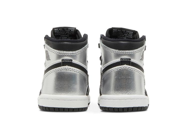 The Air Jordan 1 Retro High Silver Toe TD features a black, metallic silver, and white color scheme. The upper combines metallic silver patent leather with crinkled detailing, while black...