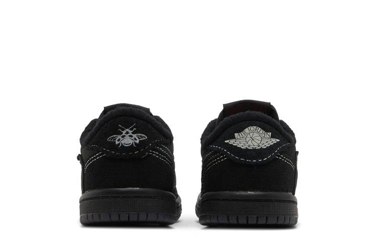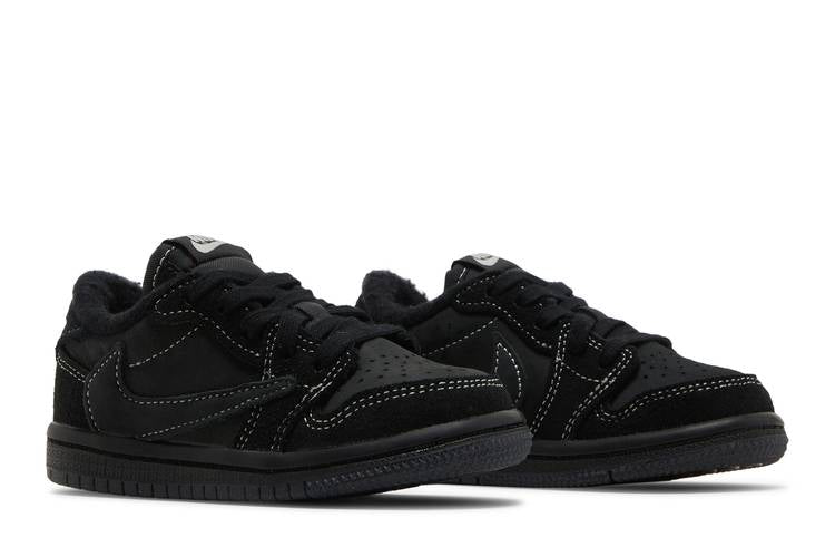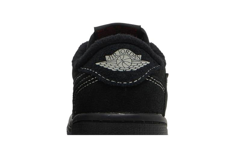 The Air Jordan 1 Retro Low OG SP Travis Scott Black Phantom TD is a toddler-sized sneaker featuring a black nubuck and suede upper with white stitching. Designed in collaboration with Travis Scott, the shoe showcases his signature reverse Swoosh on the lateral side. Additional details include a woven Nike tag on the tongue, Cactus Jack branding on the sock liner, mismatched heel tabs with the Wings logo and bee graphic, and a black rubber cupsole. Released on December 15th, 2022.