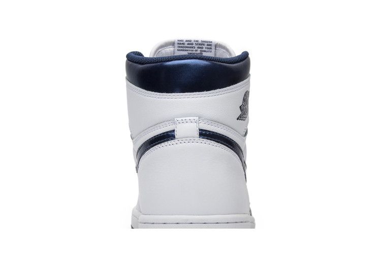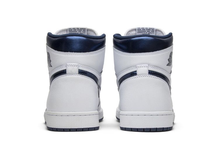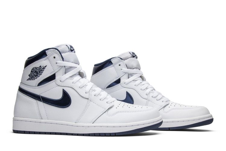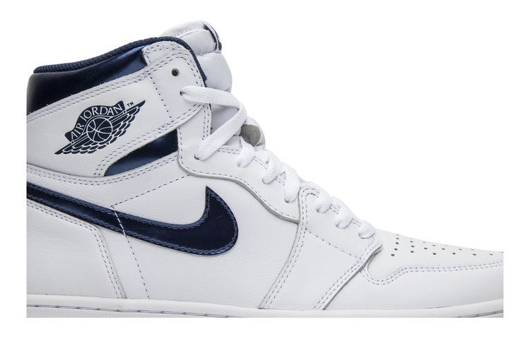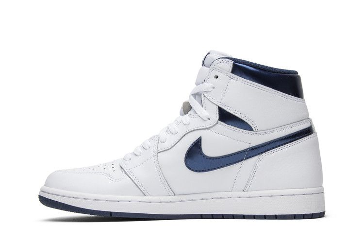 The Jordan 1 Retro Metallic Navy (2016) (GS) features a high-top silhouette with premium white leather and navy accents. It includes a navy leather collar, Swoosh, and sock liner, along...
