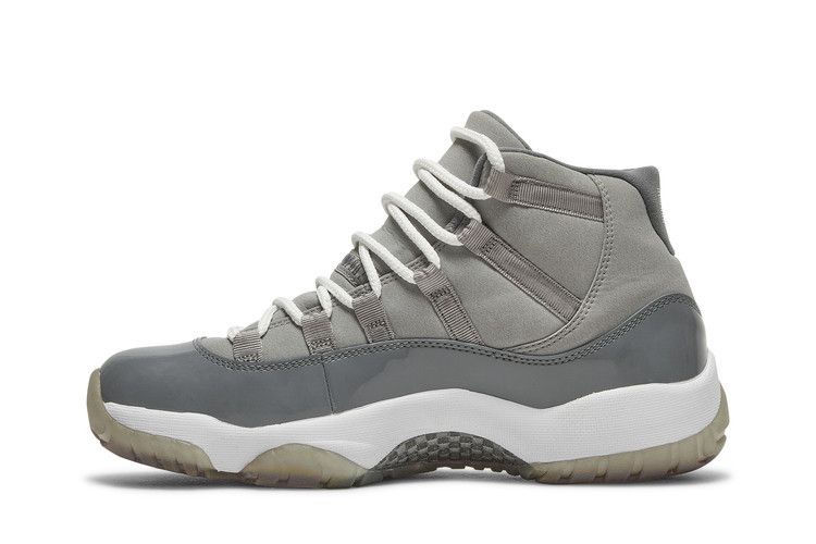 The Air Jordan 11 Retro Cool Grey (2010) features a leather upper with a rubber outsole in a light grey colorway, accented by darker grey detailing. The midsole is white,...