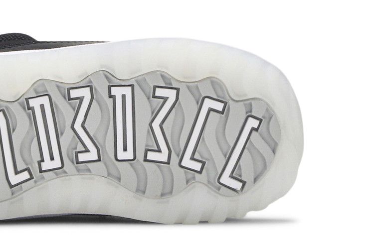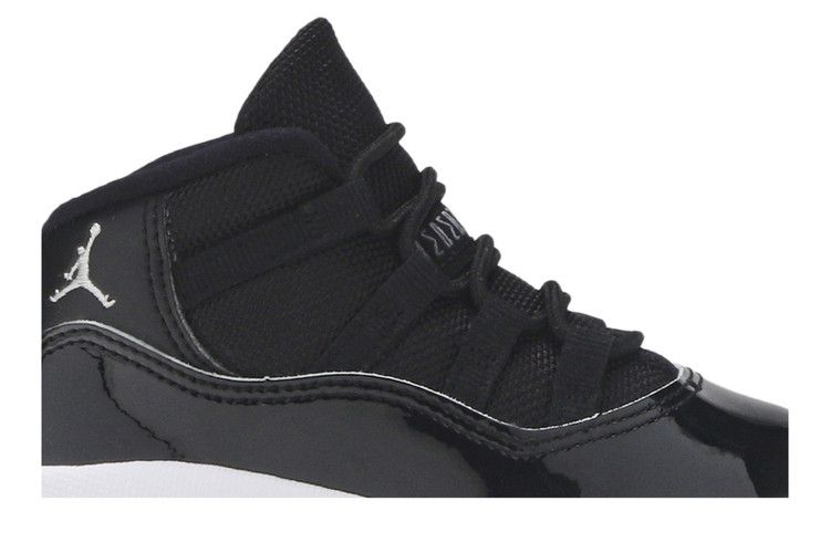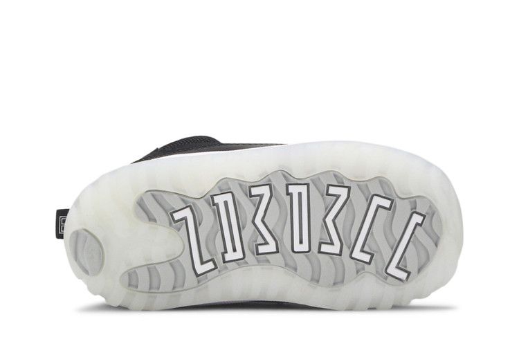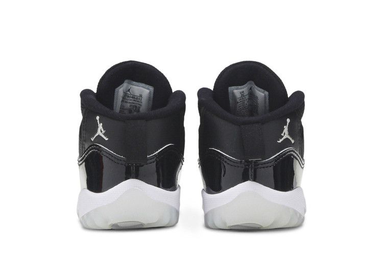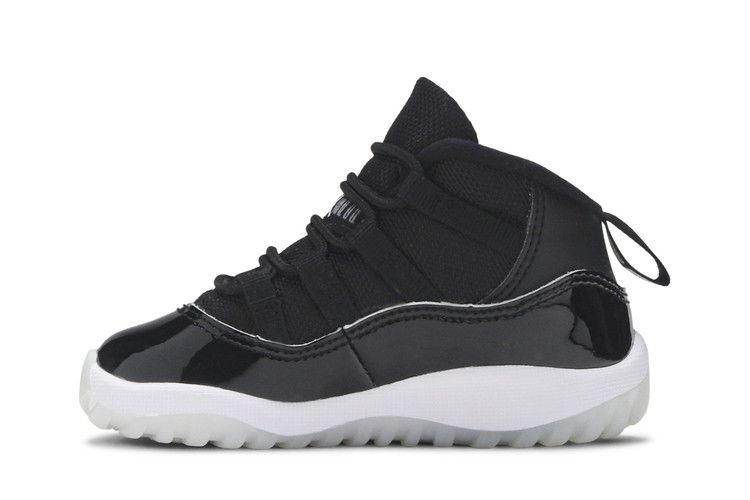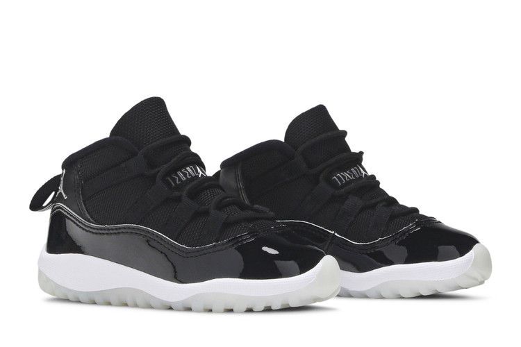 The Air Jordan 11 Retro Jubilee TD combines black and white hues with a mesh and leather upper. Patent leather overlays the mudguard, while a white foam midsole and semitranslucent...