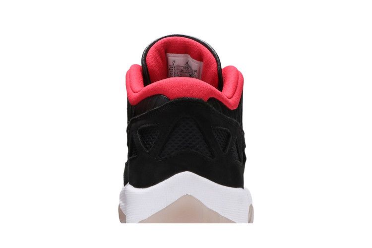 The Air Jordan 11 Low IE Bred debuted in 1995 with a distinct low-top design. It features a black tumbled leather upper with mesh inserts and Durabuck overlays, replacing the original canvas construction. A translucent sole completes the updated look.