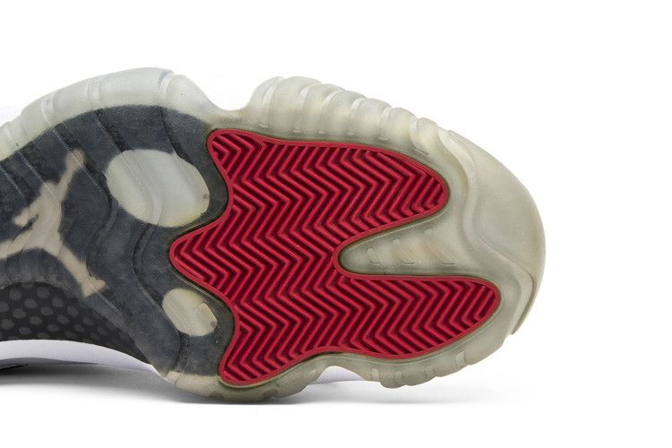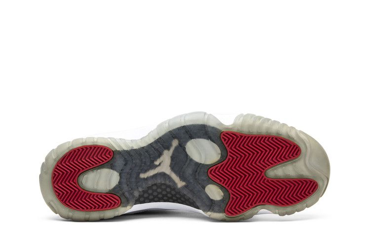 The Air Jordan 11 Retro Low Reverse Concord features a white patent leather upper with red and black branding on the heel and tongue. It includes signature patent leather overlays...