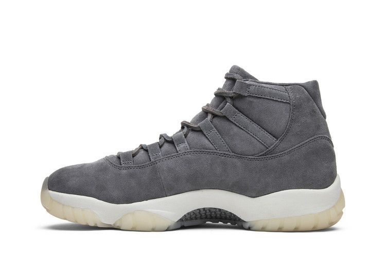 The Jordan 11 Retro Pinnacle Grey Suede features an all-suede upper in a monochromatic Cool Gray colorway, replacing the traditional patent leather and mesh. It includes a debossed Jumpman logo...