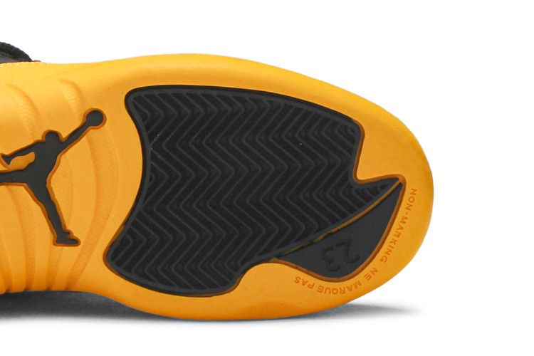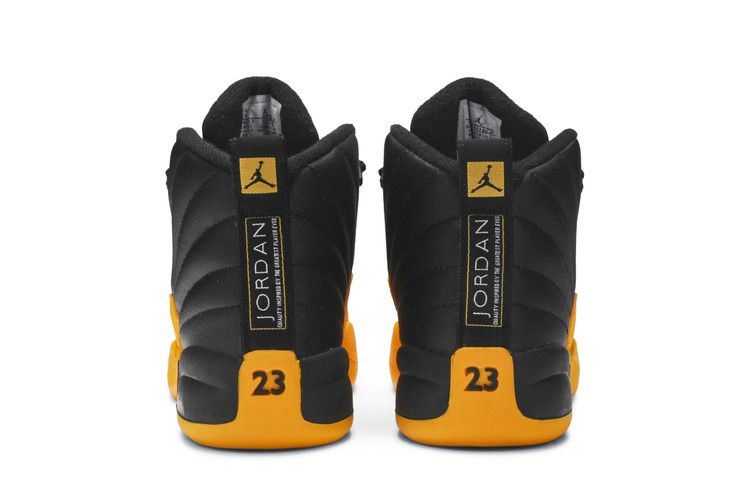 The Air Jordan 12 Retro Black University Gold PS features a tumbled black leather upper with stitch detailing and University Gold accents on the midsole, outsole, and mudguard. It includes...