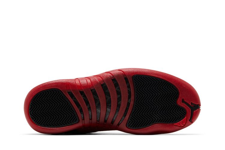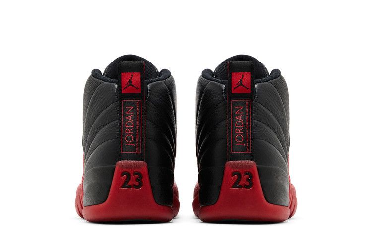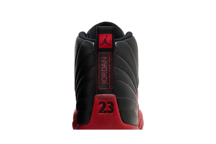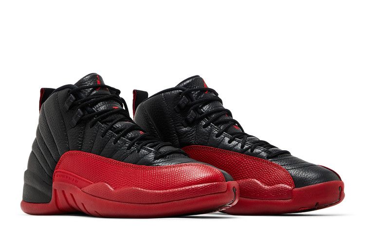 The Jordan 12 Retro Flu Game (2025) (GS) features a black tumbled leather upper with varsity red accents on the mudguard and midsole. It includes Jumpman branding on the tongue...