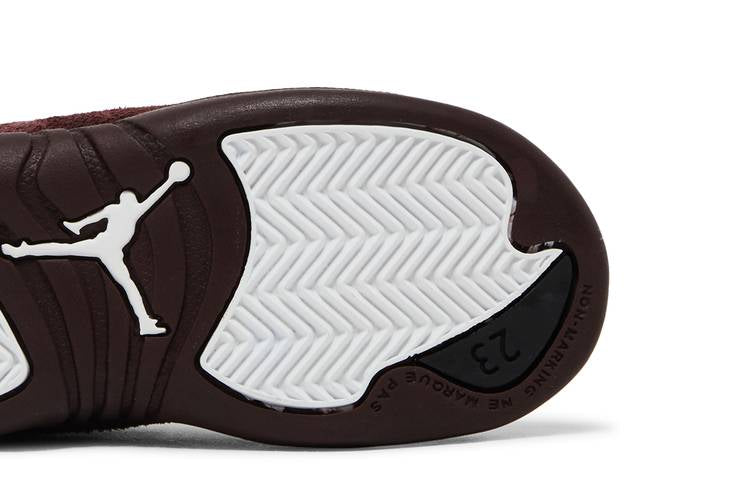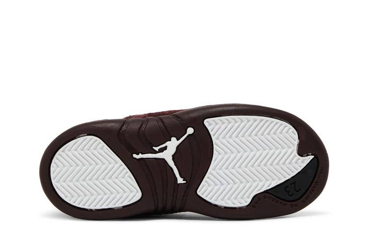 The Jordan 12 Retro SP A Ma Maniére Black (TD) is a premium toddler-sized sneaker featuring black stitched nubuck and Burgundy Crush hairy suede overlays. With waxed laces, quilted lining, and unique branding elements, this shoe offers a luxurious take on the classic silhouette. The maroon rubber outsole provides excellent traction with white herringbone pods for added grip. Perfect for the stylish young Jordan enthusiast.