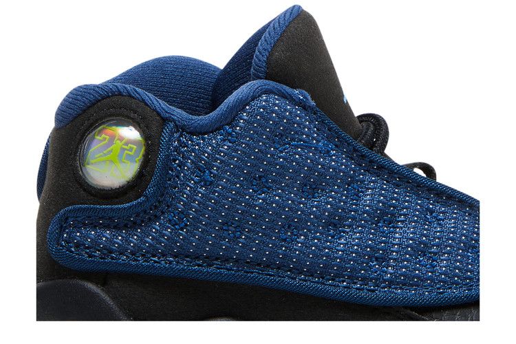 The Air Jordan 13 Retro Brave Blue (2022) (TD) features a Brave Blue dimpled nylon upper with black tumbled leather accents. It includes a white midsole and outsole, along with a University Blue Jumpman logo on the black tongue. The design closely resembles the AJ13 Flint colorway. A signature green holographic emblem is positioned near the heel. Released on April 29, 2022, the Air Jordan 13 Retro Brave Blue (2022) (TD) is available now at Side Kicks.