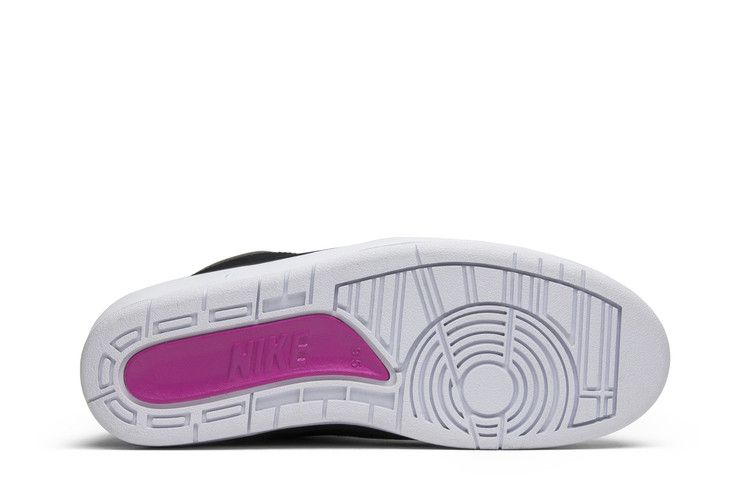 The Jordan 2 Retro Radio Raheem has a black upper with leather and suede overlays. It includes the Air Jordan Wings logo on the tongue and "NIKE" branding on the...
