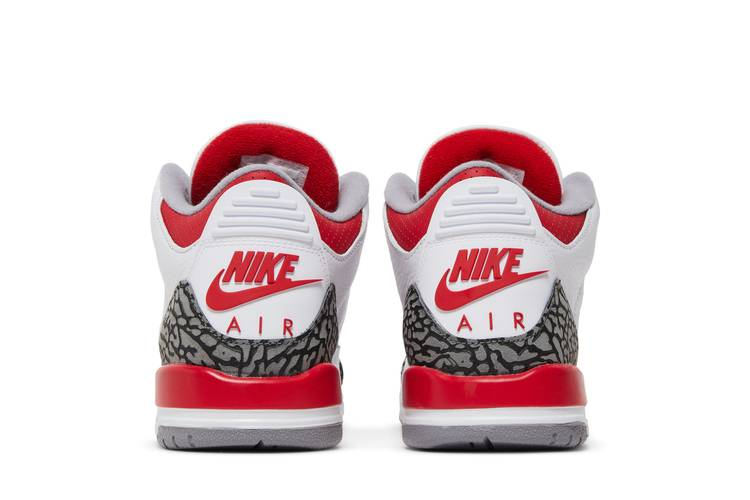 The Air Jordan 3 Retro Fire Red (2022) (GS) is a classic sneaker designed for big kids. Featuring a white tumbled leather upper with elephant-print overlays, this mid-top shoe includes scarlet accents on the Jumpman logo and Nike Air branding. The polyurethane midsole boasts a visible Air-sole unit for added comfort and style. Inspired by the original 1988 model, this shoe combines iconic design elements with modern touches for a timeless look.