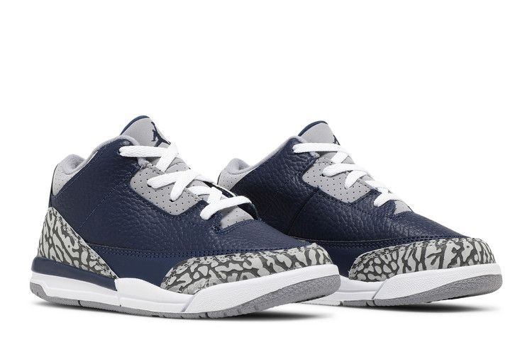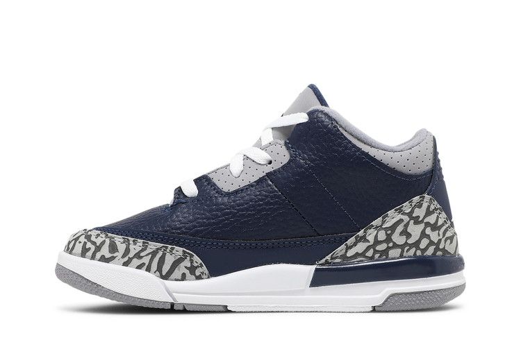 The Jordan 3 Retro Georgetown (2021) (TD) features a Midnight Blue tumbled leather upper with matching overlays above the mudguard. Cement Gray nubuck on the collar and eyestays contrasts with elephant print details on the heel and toe. The design includes a white mud guard, white laces, and a white polyurethane midsole with a Cement Gray rubber outsole.