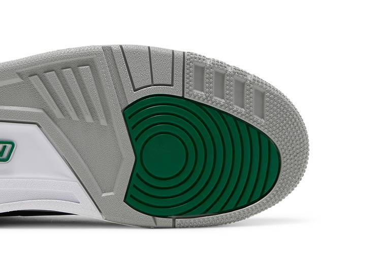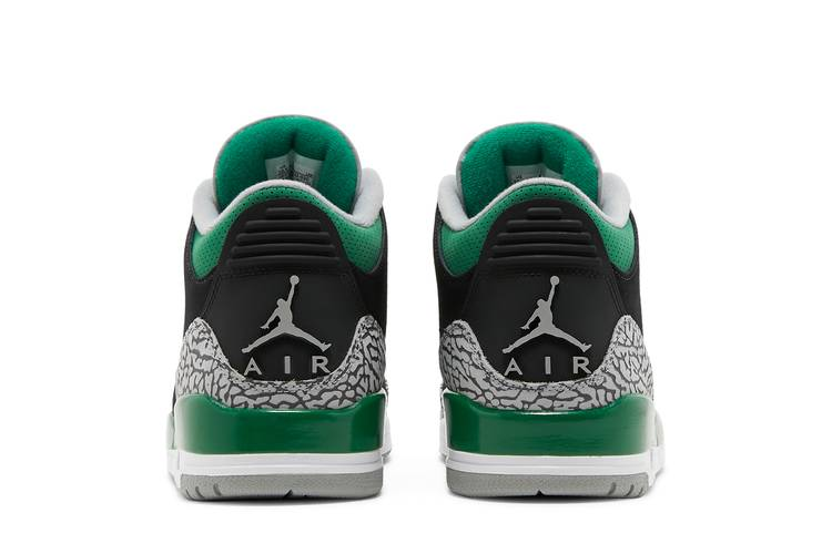 The Air Jordan 3 Retro ‘Pine Green’ features a black nubuck upper with green accents on the eyelets, collar, and tongue. Elephant print overlays and a molded heel tab with...