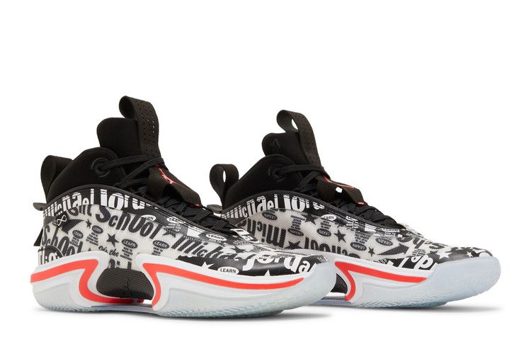 The Air Jordan 36 Flight School features a black and white colorway with "Jordan Flight" typography and Infrared 23 accents. It includes a full-length Zoom Air unit and stacked forefoot...