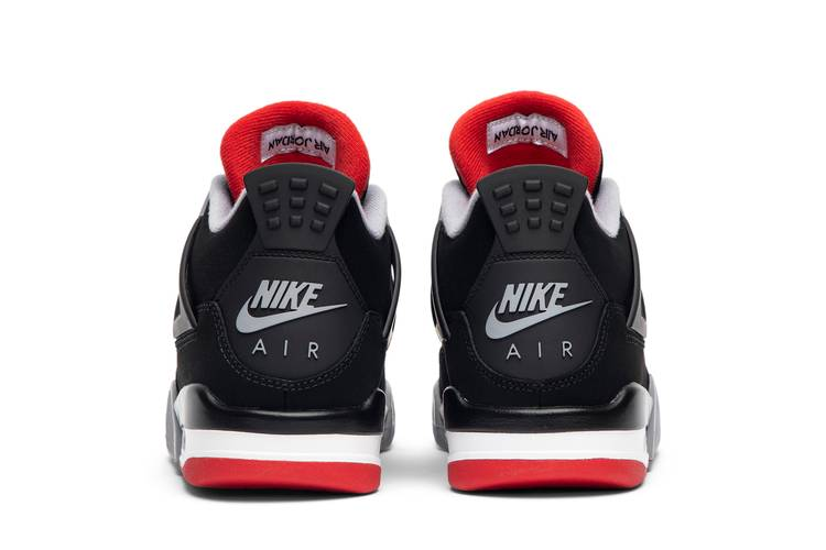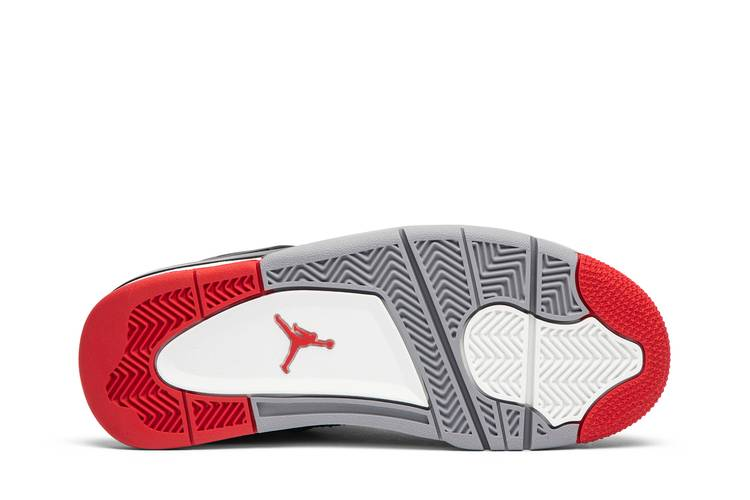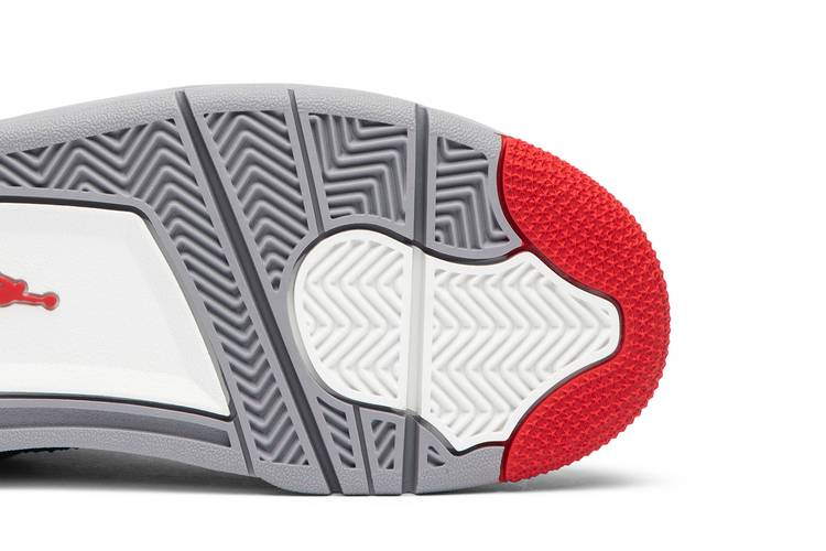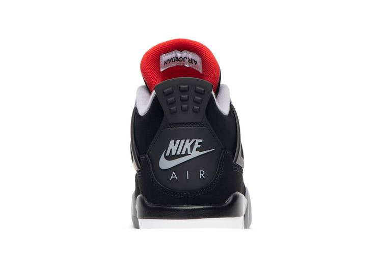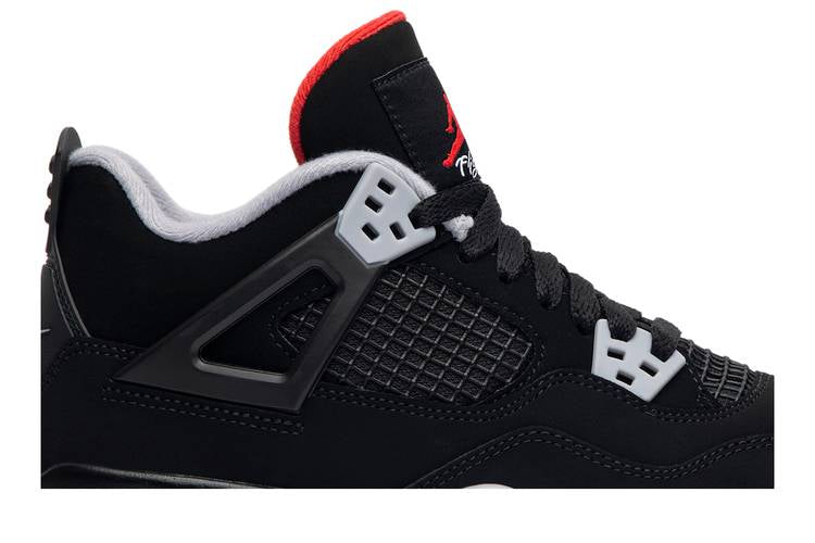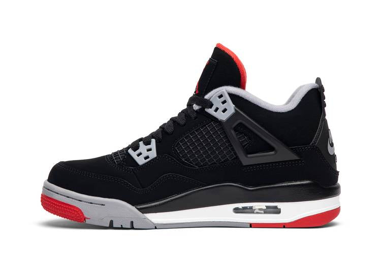 The Air Jordan 4 Retro OG GS 'Bred' 2019 features a black, Cement Grey, Summit White, and Fire Red colorway to celebrate the model's 30th anniversary. Released in May 2019, this kids' shoe stays true to the original with a nubuck upper, mesh-netted overlays, and the iconic Jumpman logo. It also includes Nike Air branding on the heel, visible Air, and a multidirectional traction pattern on the outsole.