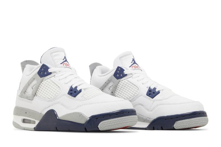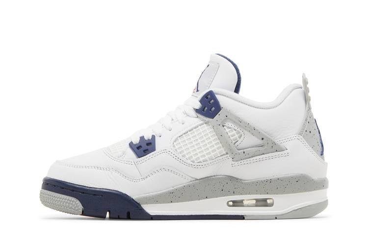 The Air Jordan 4 Retro Midnight Navy GS is a classic sneaker featuring a white tumbled leather upper with navy accents and grey detailing. The shoe offers both style and comfort, with a polyurethane midsole and visible Air-sole unit for cushioning. The design pays homage to the original 1989 Air Jordan 4, with modern updates for improved breathability and support. Perfect for young sneaker enthusiasts looking to add a timeless piece to their collection.