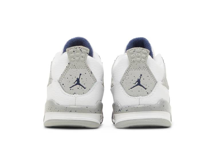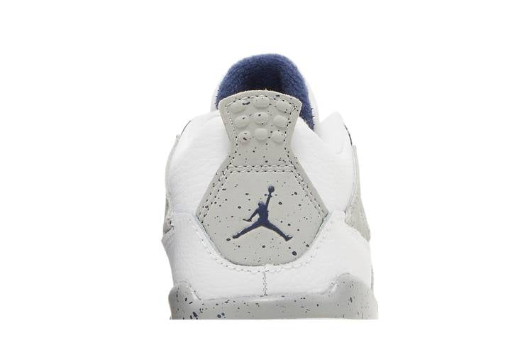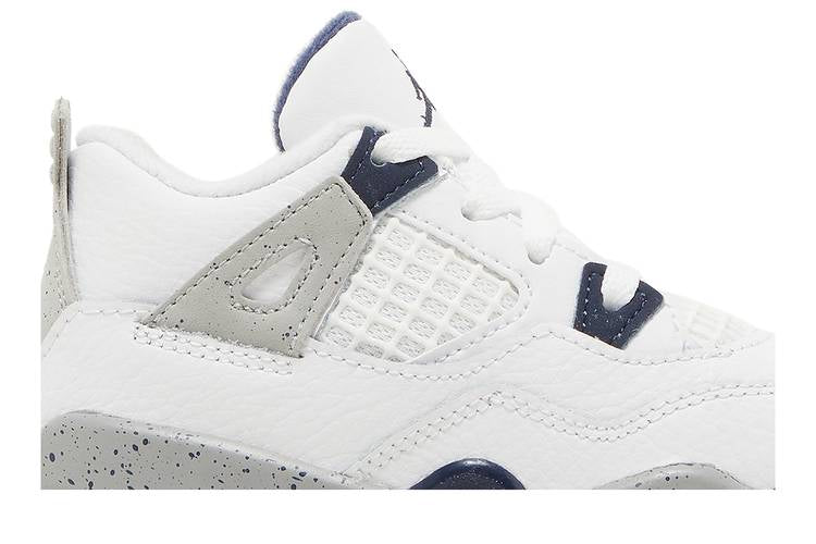 The Air Jordan 4 Retro TD ‘Midnight Navy’ features a white leather upper with netting on the quarter panels, navy eyelets, and grey wings speckled in navy. The heel tab and tongue showcase Jumpman logos, while the foam midsole offers lightweight cushioning with navy speckling. A herringbone-traction rubber outsole provides stability and grip.