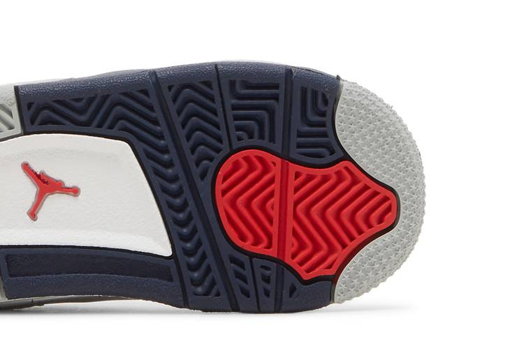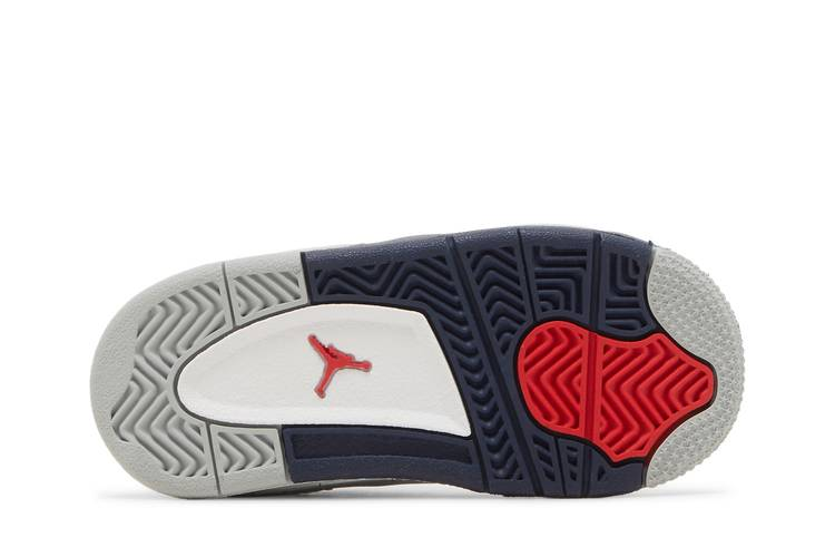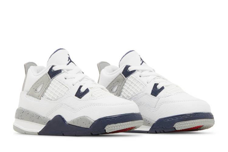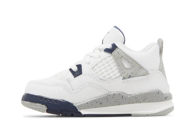 The Air Jordan 4 Retro TD ‘Midnight Navy’ features a white leather upper with netting on the quarter panels, navy eyelets, and grey wings speckled in navy. The heel tab...