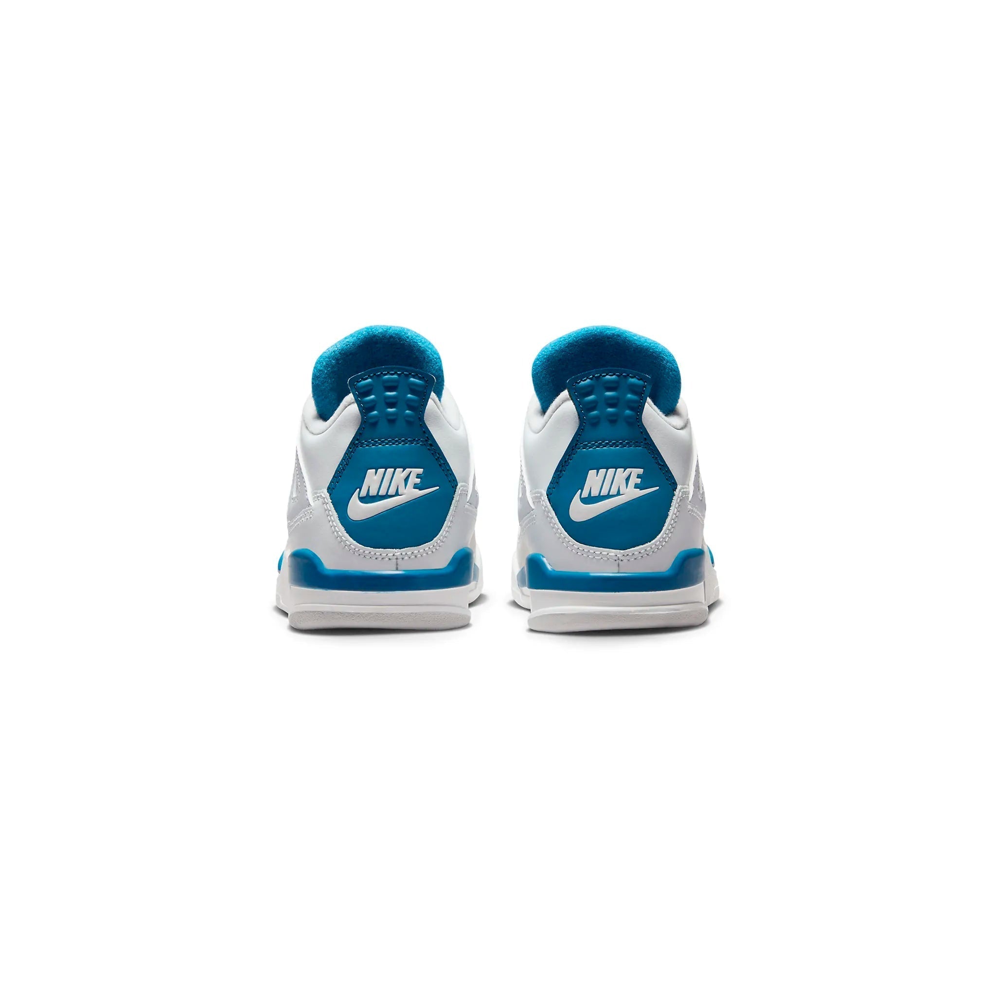 The Air Jordan 4 Retro Military Blue (2024) (PS) is a kids' shoe featuring an off-white leather upper with classic AJ4 design elements. The shoe includes quarter panel netting, TPU support wings, a blue Jumpman logo on the tongue, and Nike Air branding on the back tab. A two-tone foam midsole provides cushioning, while a herringbone-traction rubber outsole offers grip and stability.