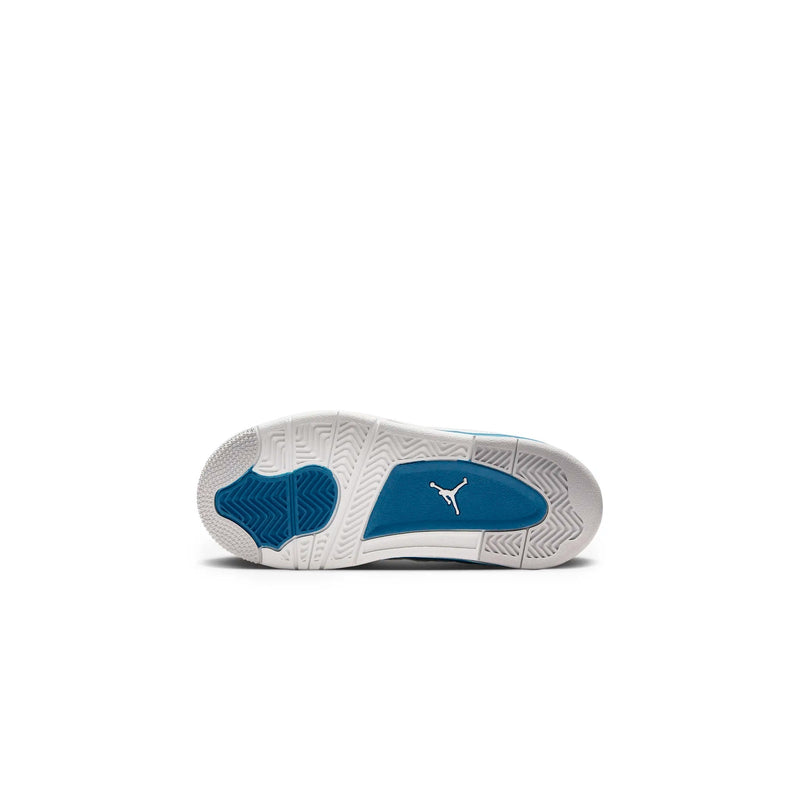 The Air Jordan 4 Retro Military Blue (2024) (PS) is a kids' shoe featuring an off-white leather upper with classic AJ4 design elements. The shoe includes quarter panel netting, TPU...