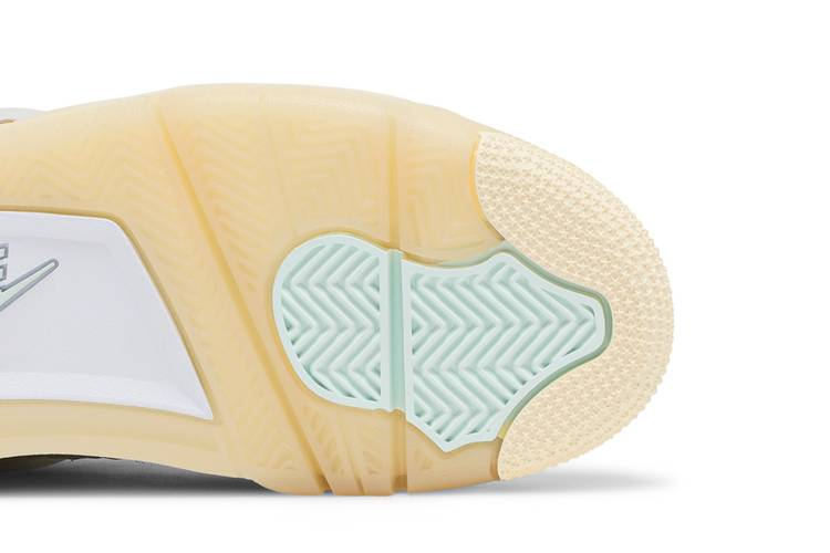 The Off-White x women’s Air Jordan 4 Retro SP ‘Sail’ features a deconstructed leather build in an Off-White finish with TPU detailing on eyelets and heel panel. Designed in collaboration with Virgil Abloh, the shoe includes signature elements like a zip tie and ‘AIR’ print. The full-grain leather uppers with mesh and translucent materials offer a unique look, with light blue accents on the tongue and outsole. This highly anticipated release from 2020 is now available for purchase.
