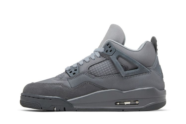 The Jordan 4 Retro SE Paris Olympics Wet Cement (GS) is a grade school sized shoe inspired by Parisian cobblestone streets. It features a mix of leather, nubuck, and suede materials in various grey tones. The design includes an embossed grid pattern on the quarter panel, speckling on TPU wings and eyelets, and Jumpman branding. The shoe boasts a dark grey polyurethane midsole with visible Air-sole cushioning for lightweight comfort.