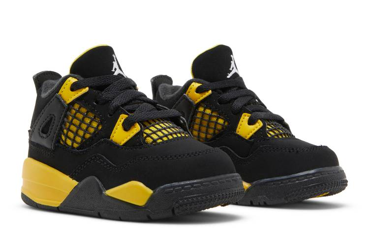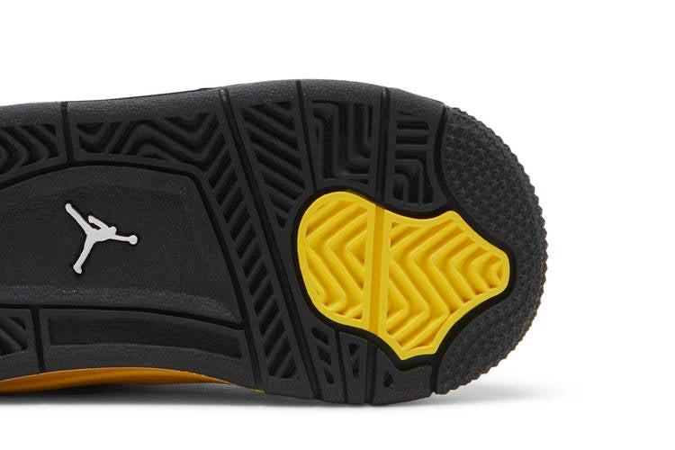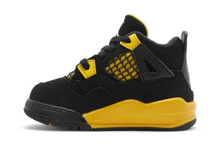 The Jordan 4 Retro Thunder 2023 (TD) features a black nubuck upper with Tour Yellow accents on the eyelets, lower tongue, and quarter panel. The classic Jumpman branding is displayed on the tongue, sockliner, and heel tab. A yellow foam midsole provides cushioning, while a black herringbone traction outsole ensures durability and grip. Inspired by the 2006 colorway, this shoe pays homage to the OG 1989 design with a modern twist.