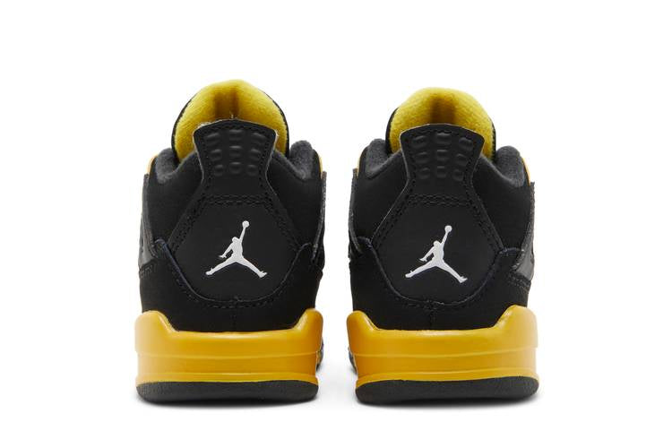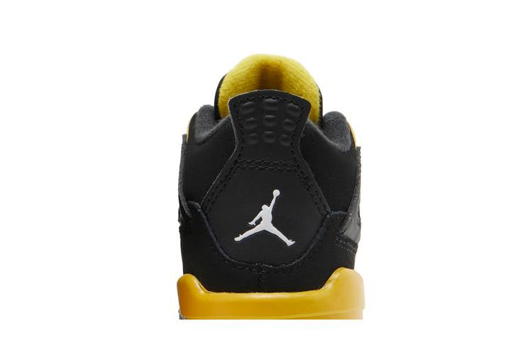 The Jordan 4 Retro Thunder 2023 (TD) features a black nubuck upper with Tour Yellow accents on the eyelets, lower tongue, and quarter panel. The classic Jumpman branding is displayed...