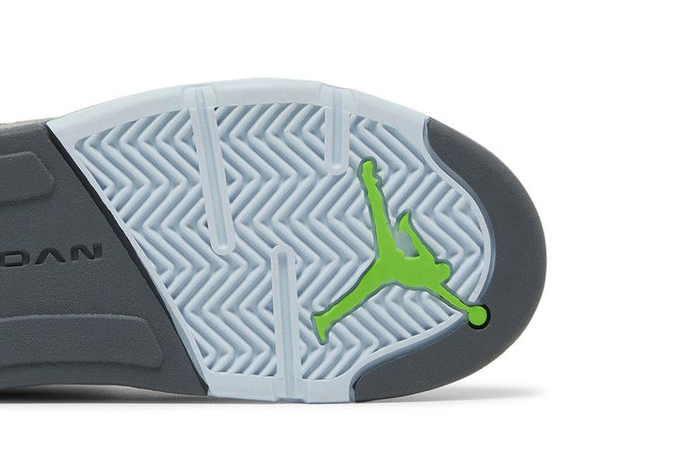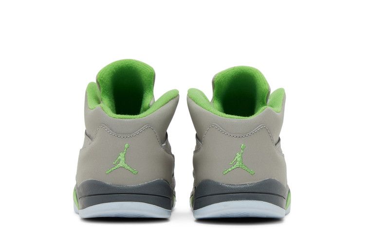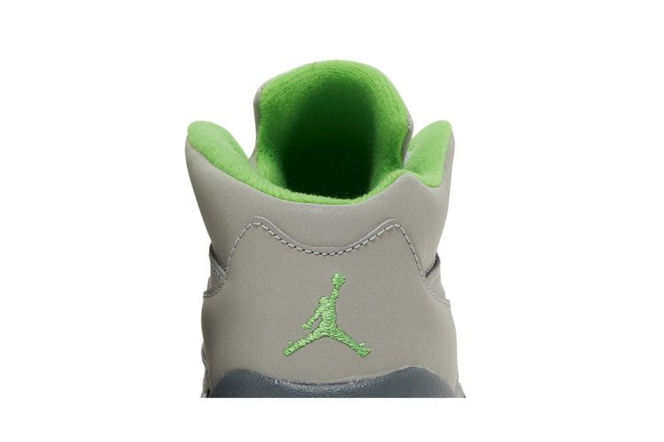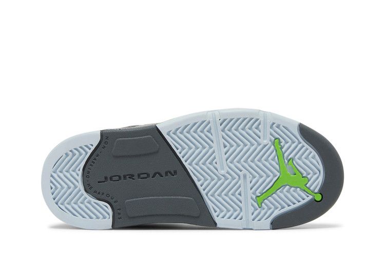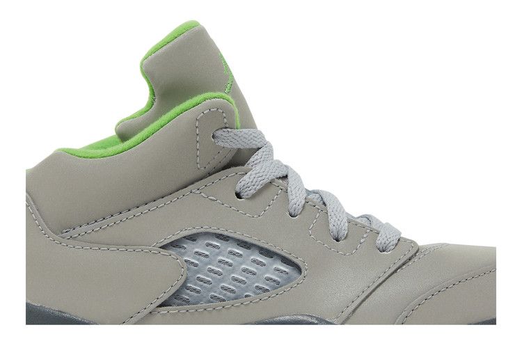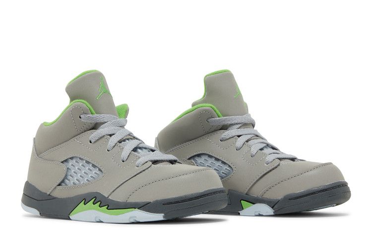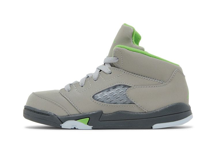 The Jordan 5 Retro Green Bean 2022 (TD) features a grey leather upper with mesh side panels and black midsole. Shark teeth details on the midsole and icy blue outsole...