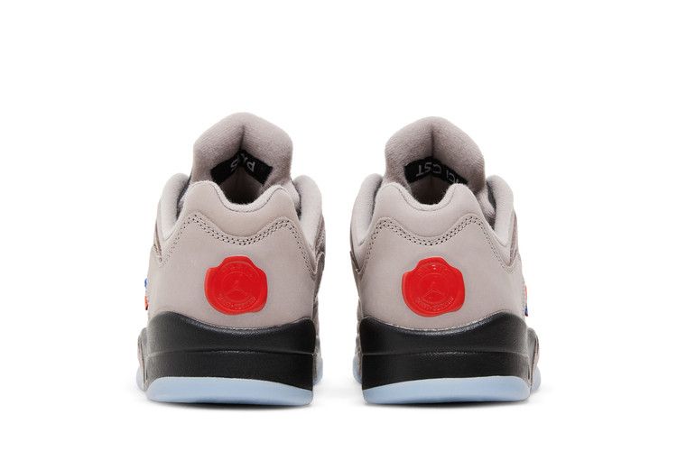 The Air Jordan 5 Retro Low PSG 2022 features a collaboration with Paris Saint-Germain, designed with grey suede uppers and bright red Jordan-branded lace toggles. It includes a "PANAME" tag...