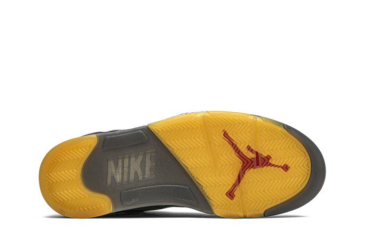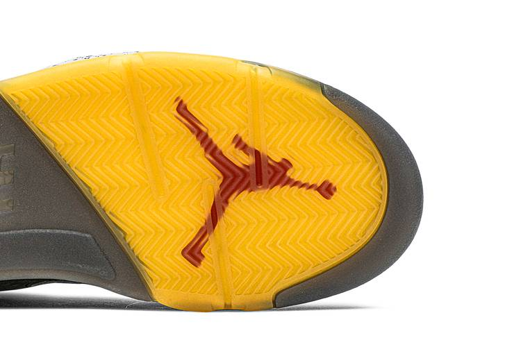 The Off-White x Air Jordan 5 SP 'Muslin' features a faded black textile upper with a silver reflective tongue and embroidered Nike Air branding. Virgil Abloh's signature details include text on the laces and quarter panel. The pre-yellowed translucent rubber outsole adds to the vintage aesthetic. This collaboration pays homage to the Air Jordan 5 Black Metallic, with a design that embraces Nike Air technology. The black textile mesh upper includes translucent panels and circular window inserts. 3M reflective tongues, fire red Jordan branding, and an aged translucent outsole complete the look.