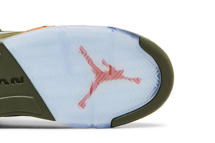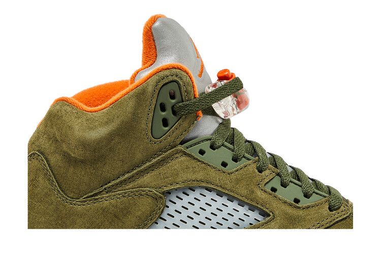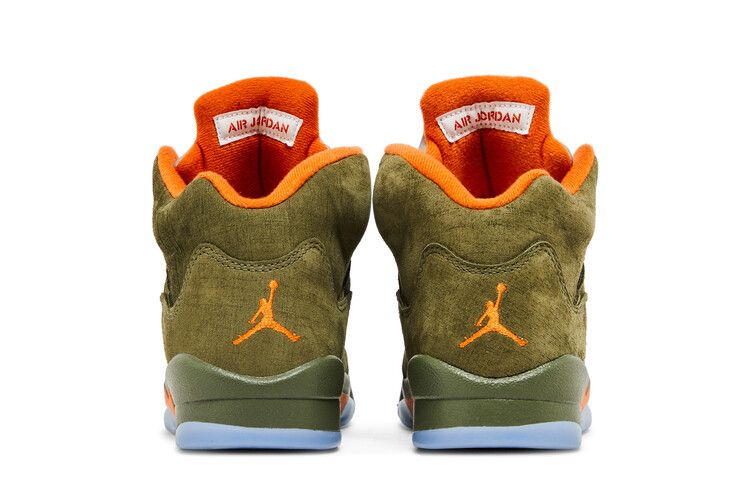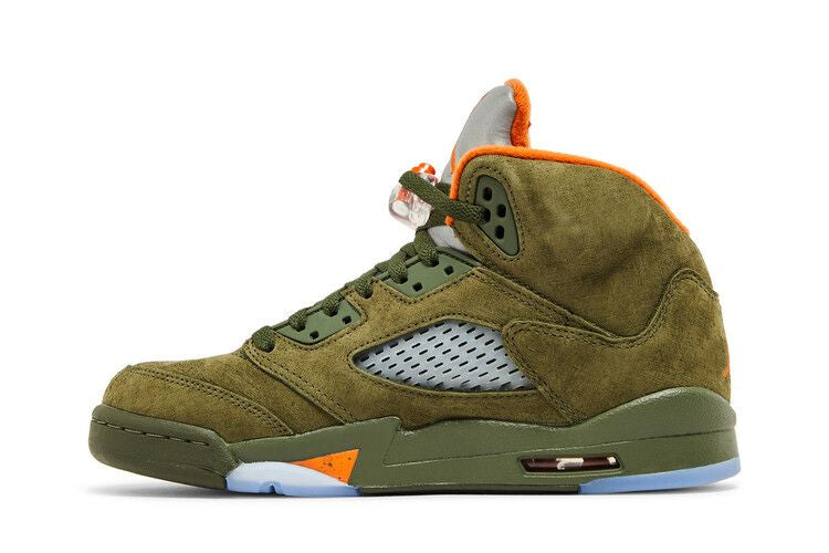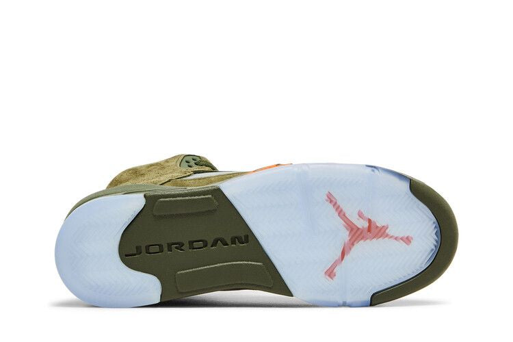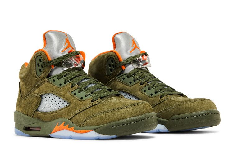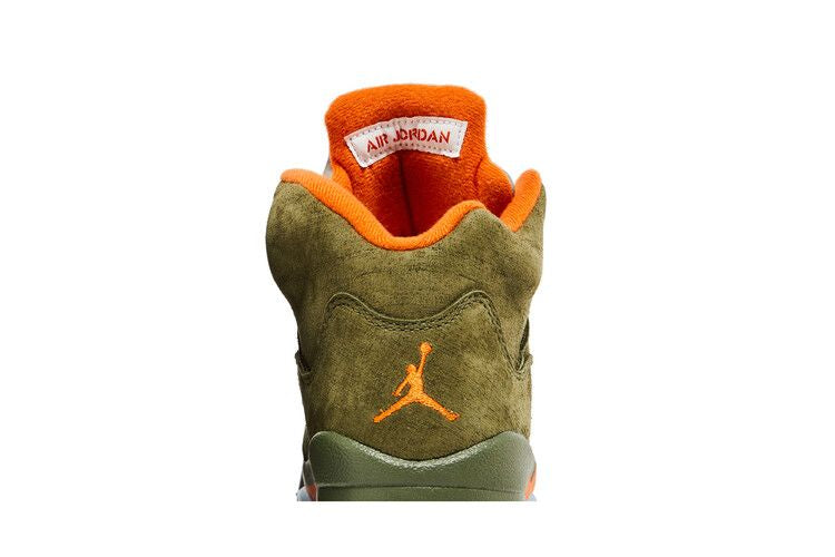 The Jordan 5 Retro Olive (2024) (GS) features an Army Olive and Solar Orange colorway, originally introduced in 2006. The suede upper includes silver reflective detailing on the tongue, lace...