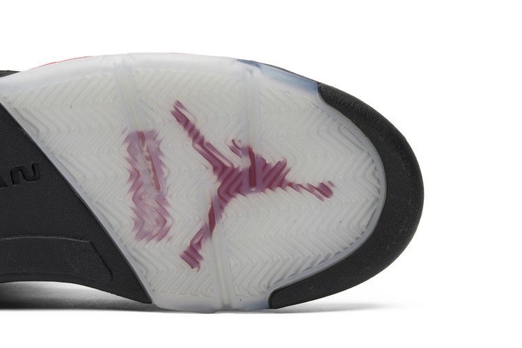 The Jordan 5 Retro Supreme Black features a black leather upper with red accents and silver detailing on the tongue. It includes a large embroidered "Supreme" logo on the side...