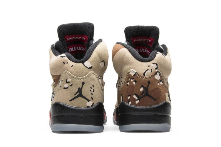 The Air Jordan 5 Retro Supreme Desert Camo features a leather upper and rubber sole. It comes in Desert Camo, Fire Red, and black colorways, with '94 branding on the...