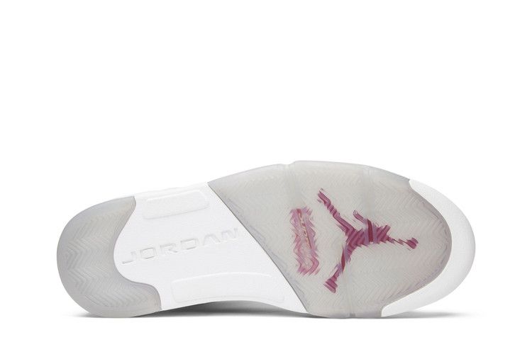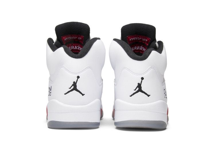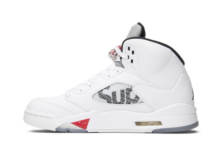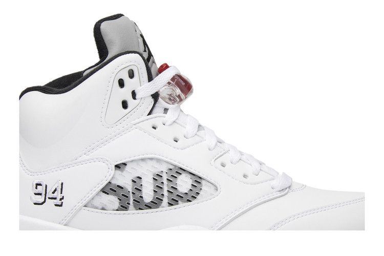 The Jordan 5 Retro Supreme White features a white leather upper with black accents on the tongue and collar. It includes translucent mesh side panels and shark teeth-inspired midsole details....
