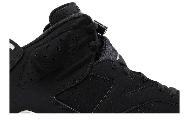 The Air Jordan 6 Retro Chrome features a tumbled leather, synthetic nubuck, and textile upper in black and metallic silver. Its mid-top design includes a black polyurethane midsole with metallic...