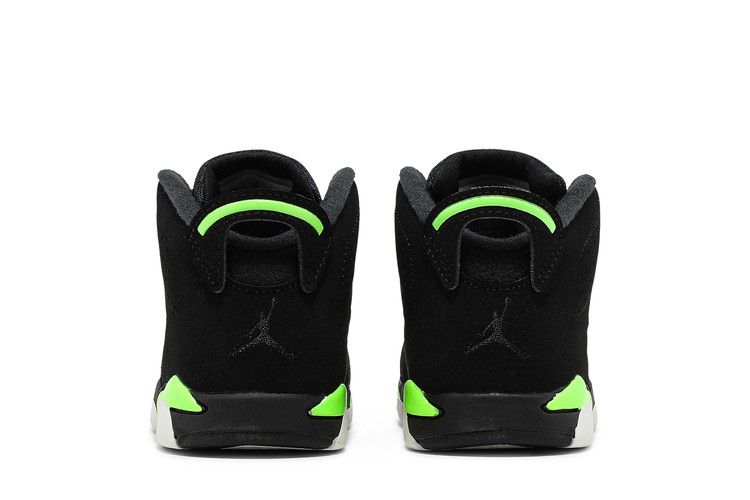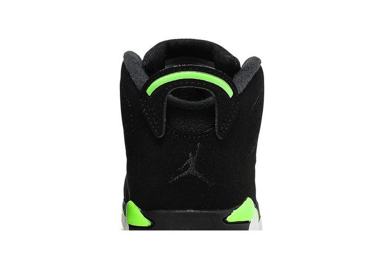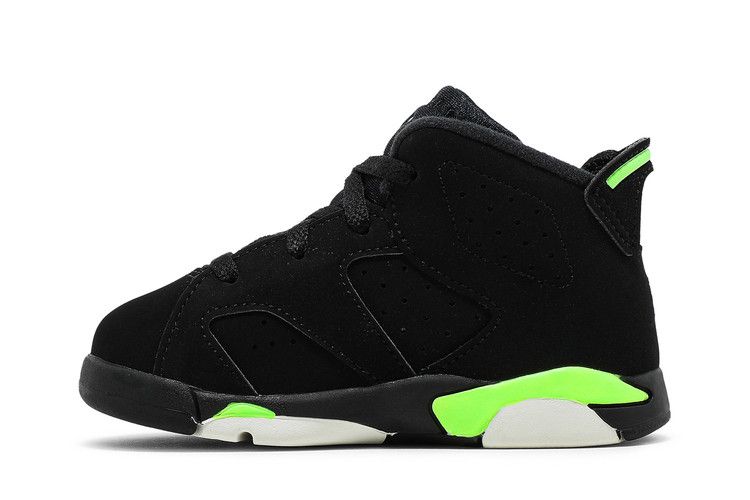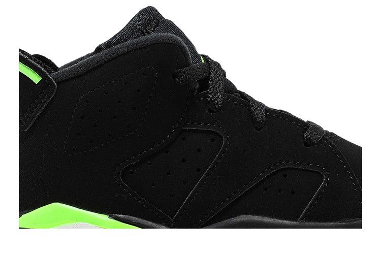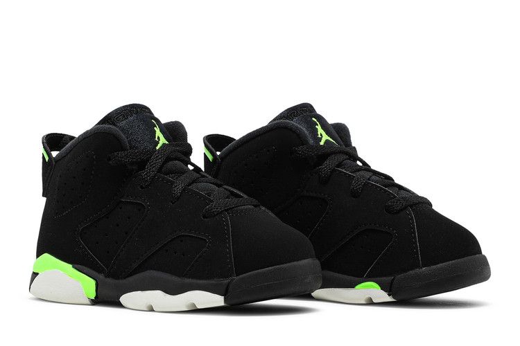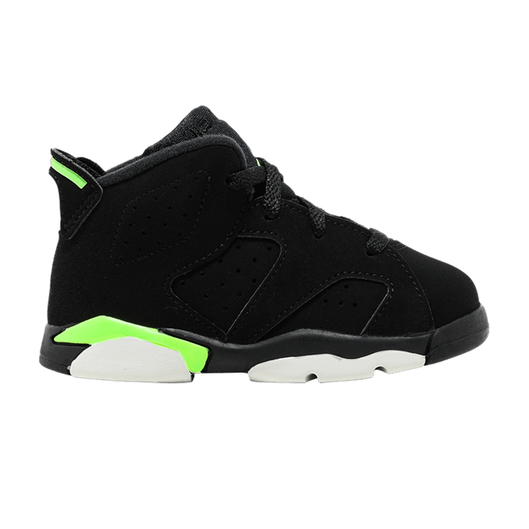 The Jordan 6 Retro Electric Green (TD) features a black nubuck leather upper with Electric Green accents on the midsole, Jumpman logo, lace lock, and heel pull tab. It includes...