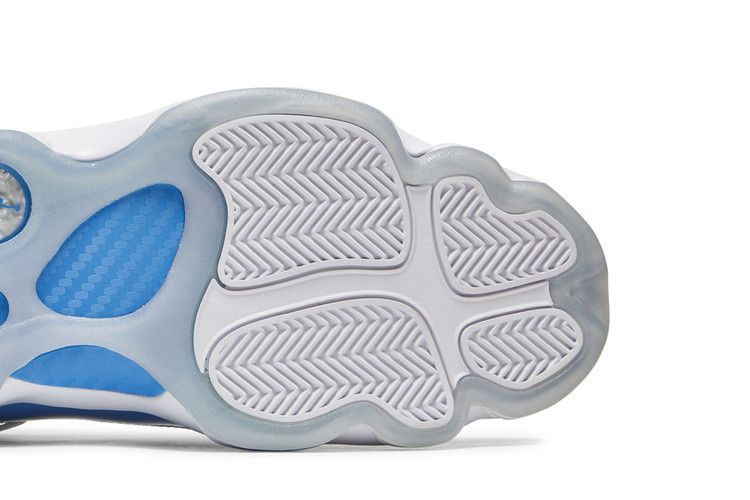 The Air Jordan 6 Rings UNC features a high-top design with a white and grey mesh base, accented by powder blue patent leather details. It includes embroidered Jumpman branding on...