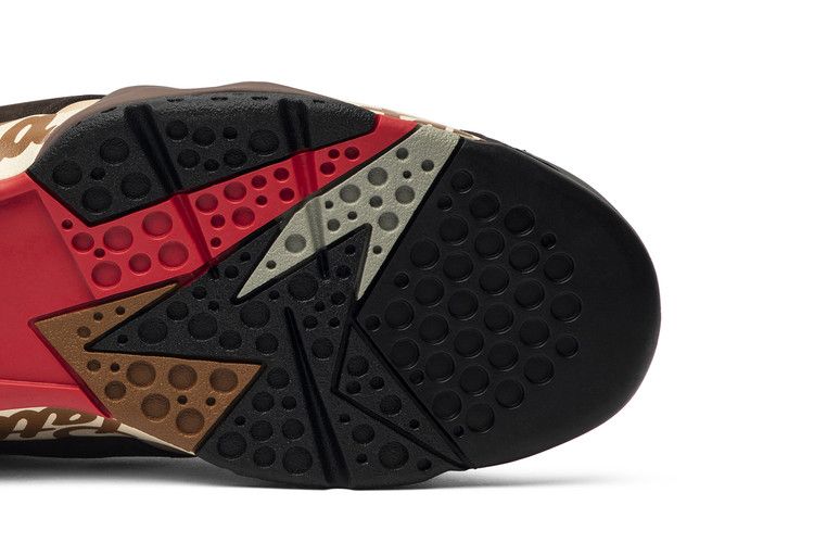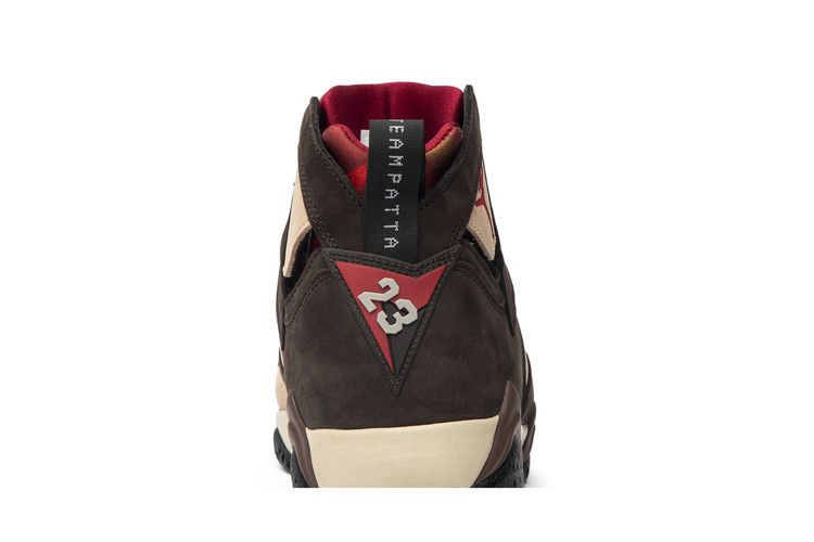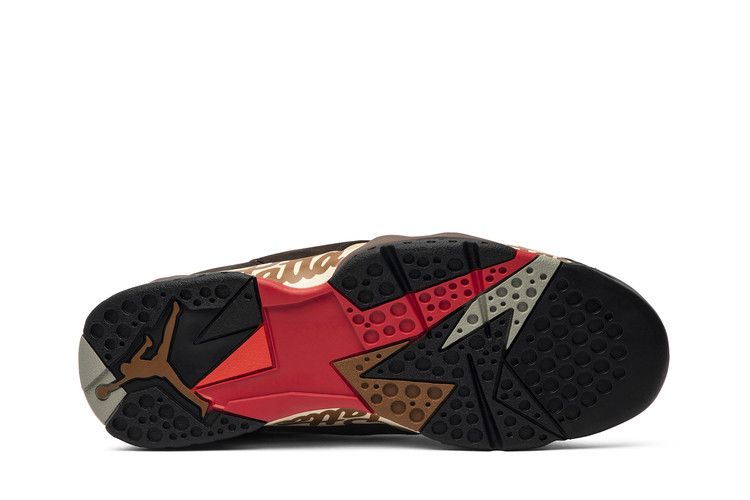The Jordan 7 Retro Patta Shimmer features a brown upper with red accents, including a red Jordan Jumpman logo. It has a brown midsole and black outsole for traction. Released on May 2019, the Jordan 7 Retro Patta Shimmer is available now at Side Kicks.