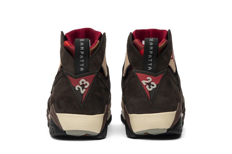 The Jordan 7 Retro Patta Shimmer features a brown upper with red accents, including a red Jordan Jumpman logo. It has a brown midsole and black outsole for traction. Released...