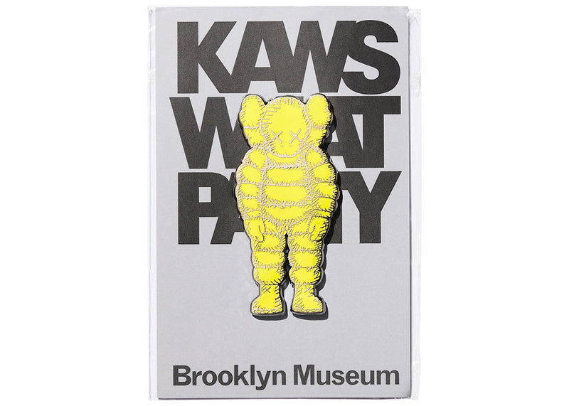 The KAWS Brooklyn Museum WHAT PARTY Pin Yellow is now available at Side Kicks!