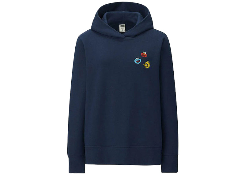 The KAWS x Uniqlo x Sesame Street Elmo Cookie Monster Big Bird Heads Hoodie (US Womens Sizing) Navy is now available at Side Kicks!